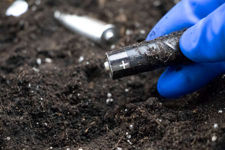 Used batteries in the ground. Hazardous waste polluting the environment. The concept of environmental protection and the recycling of batteries and batteries