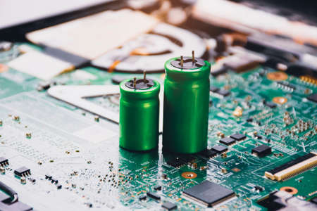 Technician repairing the electronic device. Reparing the audio amplifier. Close up at the orange capacitor.