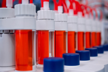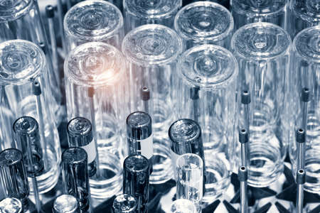 Close up woman hand in a rubber gloves put sample in a glass vial with blue cap into the autosampler rack in HPLC system. High performance liquid chromatography for separation compounds . Scientific and research work at chemical or clinical laboratory