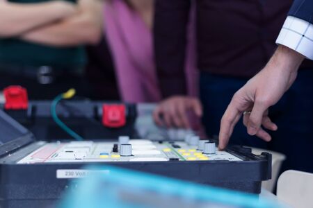 Engineering students working in the lab. Students are adjusting an electrical's components inside lab.