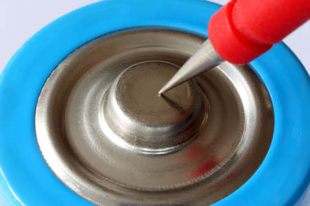 Electric vehicle lithium NMC battery with multimeter. Electric car battery manufacturing factory. Lithium-ion cell. Lithium NMC rechargeable battery. EV car energy storage. Automotive battery cell.