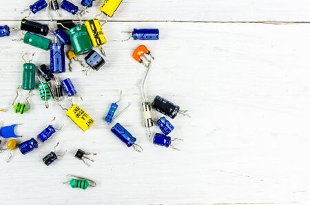 An electrician's workplace. lots of different electrical parts. Electronics. Copy space