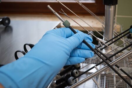 in a central sterilization department, the instruments used for an endoscopic operation are placed in a washing basket for endoscopic instruments