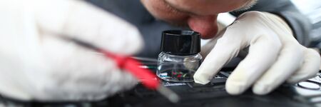 Close-up of laptop technical support. Technician examining and analyzing parts of disablement computer through magnifying glass. Male in gloves fixing gadget and soldering with welding machine