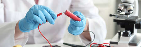 Close up hands wear blue gloves holds mini light bulb kit to demonstrate science experiment about electricity circuit. Concept, scientific tool for education, lab lesson.