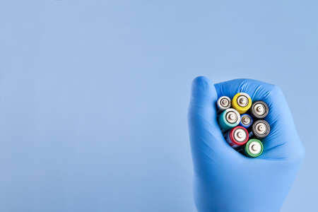 Batteries in the hand of a man in a protective glove, copy space, battery recycling theme.