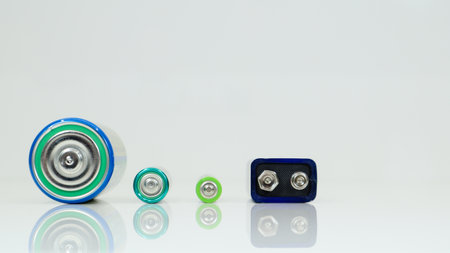 Battery type D or C, PP3, AA, AAA on a white background with reflection. View of metal alkaline batteries with copy space. Mandatory processing