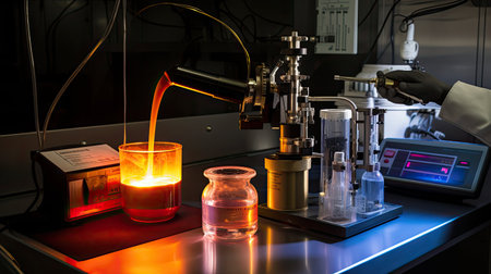 This captivating image showcases laboratory equipment featuring glass containers filled with vibrant purple liquid, emphasizing modern scientific research and experimentation.