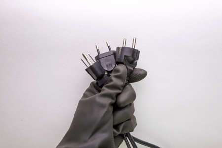 concept of energy dependence: several different plugs and cables in the person's hand, black protective glove