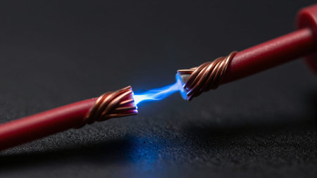 Two exposed ends of red electrical wires emit a bright blue electric arc and intense sparks, illustrating a hazardous short circuit or powerful discharge. This highlights the inherent dangers and raw energy of electricity in a striking visual.