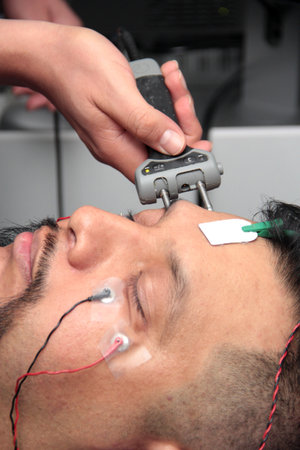 Electromyography EMG and facial nerve conduction velocity NCV to assess nerve damage from facial paralysis in a Latino male