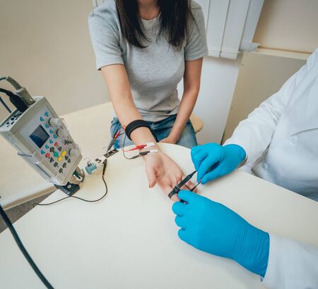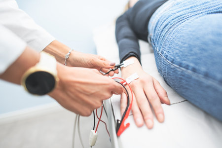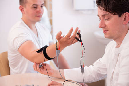 Doctor using electromyography electrodes connected to a laptop to measure muscle activity of a patient's forearm