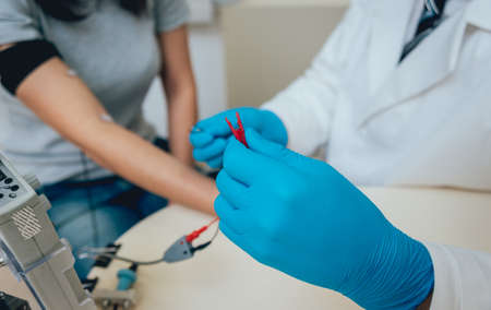 Electrocardiogram for heart and pulse measurement in hospital. Annual health check. Nurse measuring patients blood pressure electrocardiography. ECG