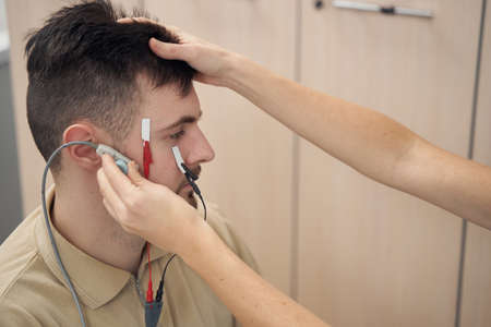 Tranquil patient undergoing an audiometry test performed by an audiologist