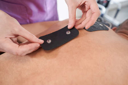 Physiotherapist applying electrical muscular stimulation device on man chest muscles