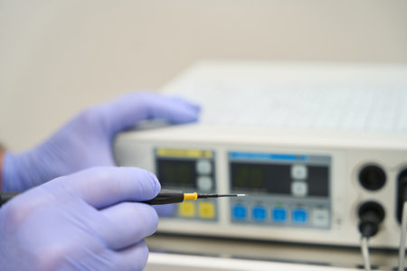 aesthetic salon spa procedure. adjustment. anti cellulite treatment device setting. electrostimulation woman body machine setup.