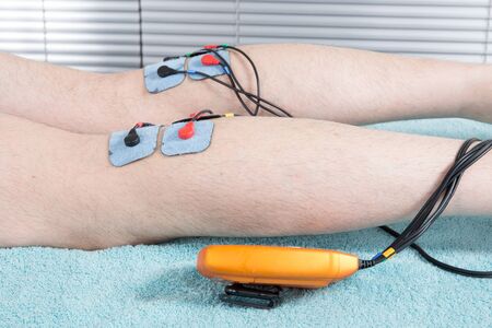 Electrodes of an electrostimulator on the leg of a male athlete.