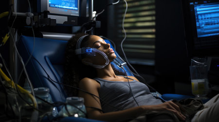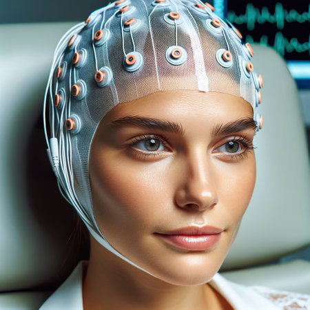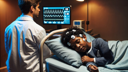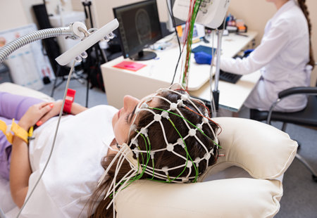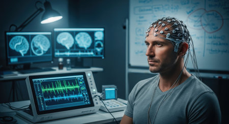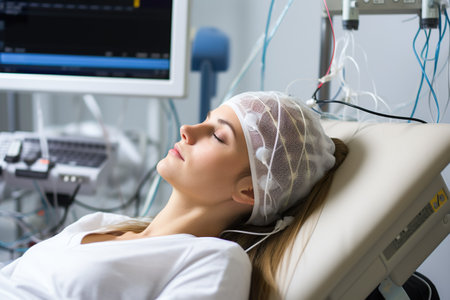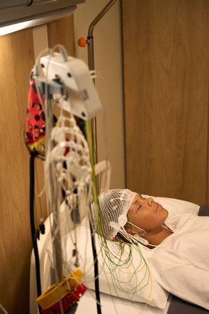 A patient is monitored with EEG equipment, offering detailed analysis of brain activity in a clinical setting. Generative AI