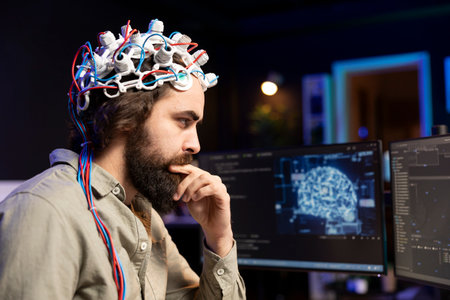 A focused scientist with an EEG cap on their head sits in a lab with multiple screens displaying neurological data.