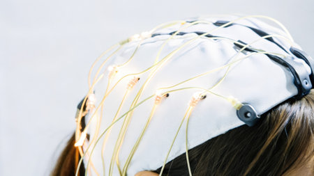 A detailed view of the EEG sensors electrodes secured with conductive gel on a users scalp emphasizing the connection between the technology and the human brain as research data is.