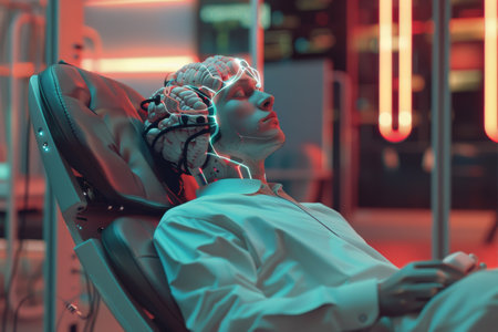 Cuttingedge futuristic brain interface experiment, a hightech neural connection technology with wires. Electrodes. And ai for closeup brainwave monitoring and healthcare diagnostics