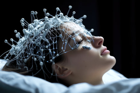 Futuristic sleep: woman wearing neural network headset for advanced dream exploration.