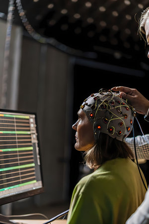 This AI-generated image depicts a researcher's hand carefully adjusting an Electroencephalography (EEG) headset on the head of a subject, viewed in profile. The headset is fitted with numerous electrodes, some of which are illuminated with red light, indicating active monitoring. The subject is intently looking at a computer monitor displaying complex scientific data, likely brainwave patterns or neurological readings. The background suggests a dimly lit neuroscience laboratory or a research testing environment, with equipment and soft lighting. This conceptual image, created with artificial intelligence, captures a moment of scientific research, brain activity monitoring, neurofeedback, and the study of human cognition and brain-computer interfaces