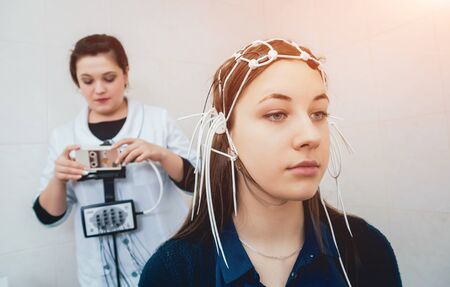 patient with encephalography electrode. medical examination Electroencephalogram studying the vascular system of the brain (EEG) Rheoencephalography