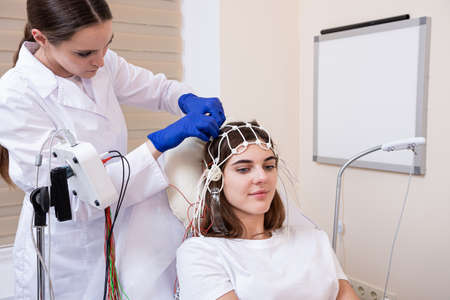 Doctor and patient with encephalography electrode. Electroencephalogram EEG