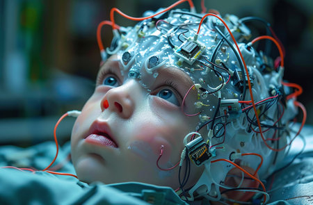Conceptual image of a child with a cybernetic brain, depicting futuristic biotechnology and artificial intelligence with intricate wiring and electronic components.