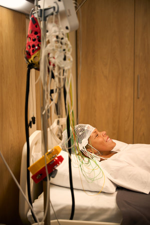 Patient undergoing brainwave monitoring hospital room medical procedure calm environment close-up view neurological study