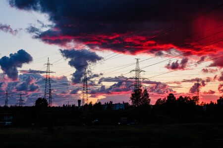 Beautiful red sunset and high-voltage lines