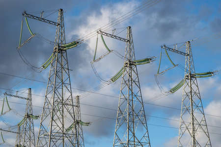 Power line supports at the beautiful sky background. Power supply concept