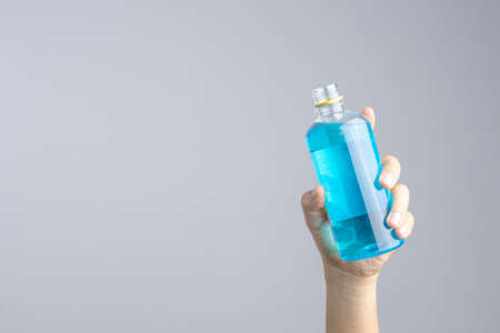 Hand holding opened blue alcohol bottle on white background