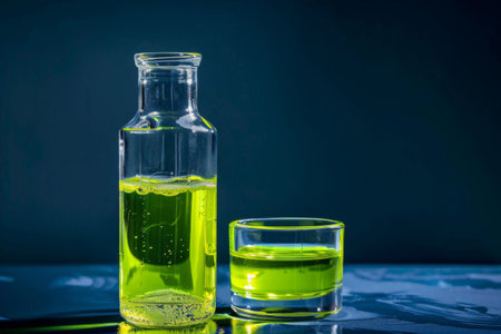 A green liquid bottle is placed next to a glass filled with clear water. The contrast between the two liquids is evident, with the green standing out against the transparent water.