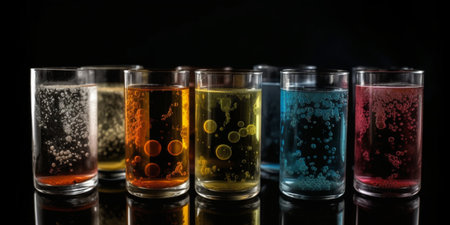 A colorful row of glowing liquids in glass bottles on black background for science and nightlife concepts