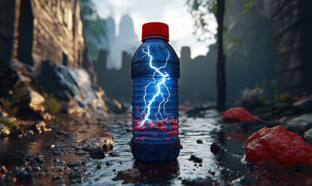 Electrified water bottle in post-apocalyptic ruins; environmental disaster concept