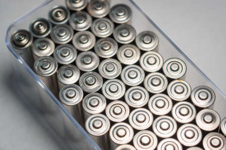 Close up top view on blurred rows of selection of AA batteries energy abstract background of colorful batteries. Alkaline battery aa size. Several batteries are next to each other. Many aa batteries.