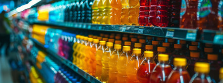 A vibrant scene of colorful bottles of various drinks neatly lined up on supermarket shelves, with soft focus and dynamic lighting creating a lively and modern retail atmosphere. Ideal for themes related to beverages, shopping, and consumerism.