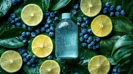 A colorful beverage bottle surrounded by lemons, blueberries, and green leaves, creating an inviting scene