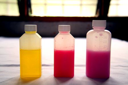 Bottled Liquids Three bottles with colorful liquids against a vibrant bokeh background.