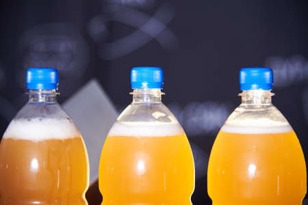 draught beer in bottles close-up. Beer bar on international beer day. Brewing at home.Draught beer stores
