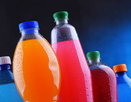 Plastic bottles of assorted carbonated soft drinks in variety of colors