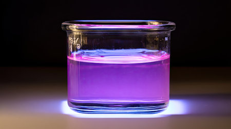 A glass beaker filled with a vibrant purple solution is illuminated from below, capturing the essence of a unique chemical experiment in a laboratory setting.