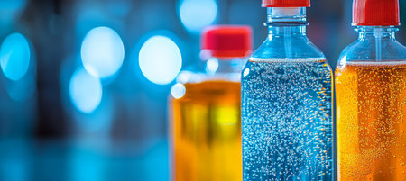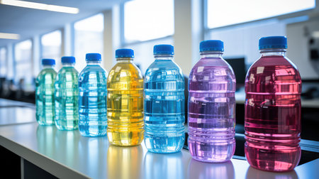 AI Generated. Two plastic bottles filled with blue and yellow liquid placed on table under sunlight