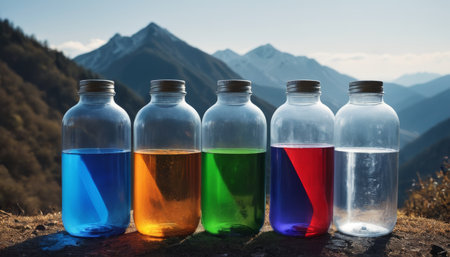 Colorful bottles filled with liquid against a mountain backdrop