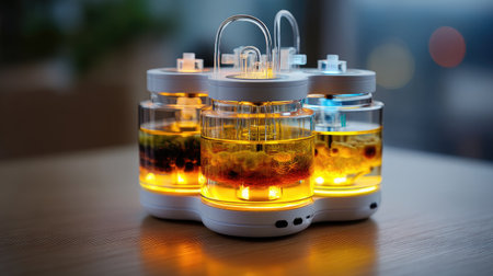 Scientific experiment in a row, illuminated equipment reflects multi colored liquid generated by artificial intelligence