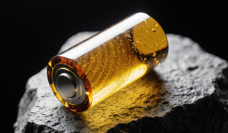 A vibrant battery glistens with golden hues, positioned on a rough stone base. The soft lighting highlights its unique design, creating an elegant yet industrial look full of potential.