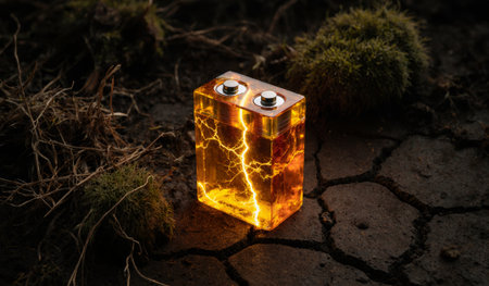 A glowing battery stands out against the cracked earth, radiating electric energy through vibrant lightning patterns. Nature surrounds it with green moss, creating a striking contrast.
