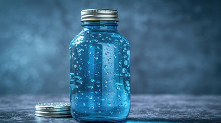 Blue liquid in glass bottle on wet surface